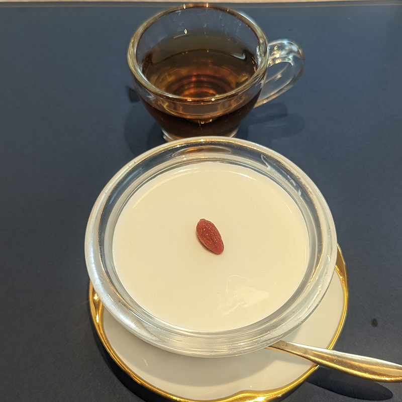 デザートにはごま団子と杏仁豆腐が供された。どちらも香り高い。特に杏仁豆腐は水っぽさがなく杏仁霜の香りが感じられる。