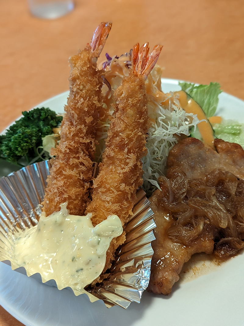 エビフライは衣がサクッとしたいい揚げ具合で油切れもいい。ポークジンジャーは肉にはしっかりと火が入っているせいかやや食感は固め。ソースは玉ねぎを丁寧に炒めてあるのでやや甘めの味付け。