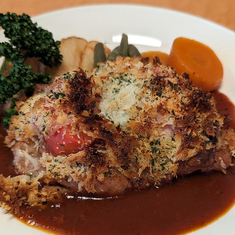 焼いたパン粉の香ばしさとトマトとベーコンが効果的で更に隠し味に使われているマスタードの酸味がいいアクセントになっている。デミグラスソースとの相性もよく隠れた逸品。