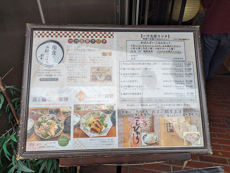 一汁五菜と銘打たれたランチメニューは6種類の中からメインとなるおかずを選択。料理は定番メニューが5種類と日替わりが1種類という構成で肉と魚がバランスよく入っている。これに旬菜3種の小鉢とデザートの小鉢が付く。更に白米か酵素玄米のどちらをチョイス。