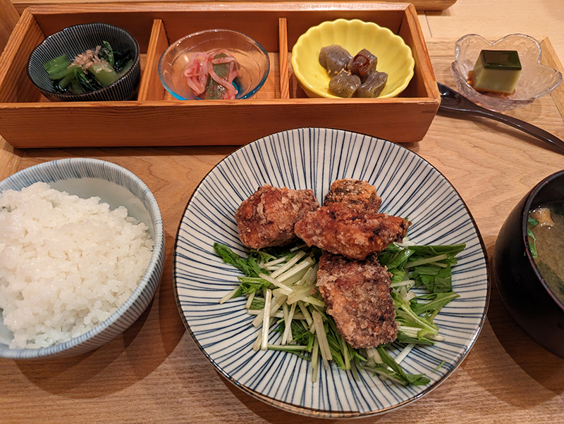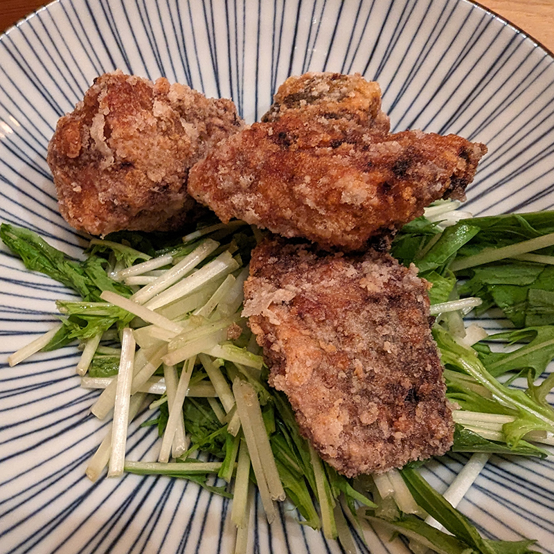 竜田揚げはカリッと油切れよく仕上がっていて鰹にも火が入りすぎないところがいい。