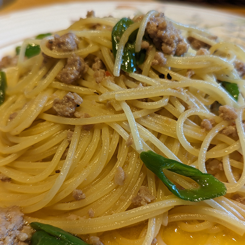 甘辛豚ひき肉と獅子唐のアーリオオーリオ