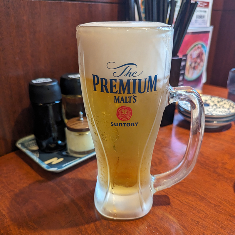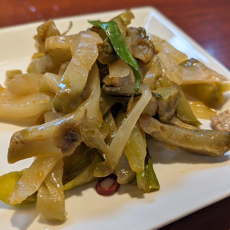 まずはビールを頂きながら料理の登場を待つ。おつまみにはザーサイ炒め(小)を。ごま油の香りで全体的に角が取れて丸みを帯びた味付けで食べやすい。