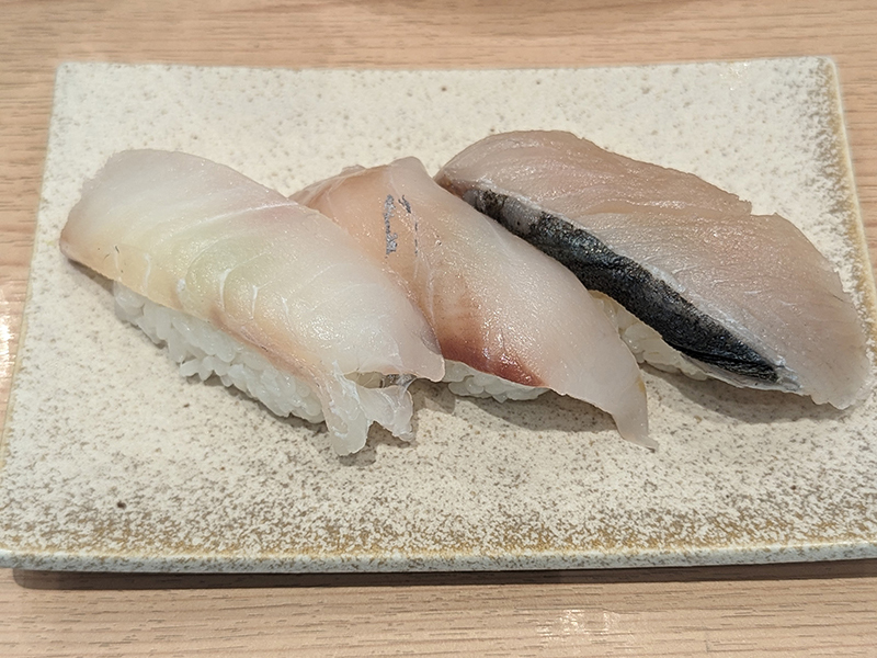 房総の白身魚を集めた地魚三貫のセットメニュー。普通に頂けば無難な感じがするが、お店の看板でもある房総の地魚ということでかなり期待しすぎたかも。