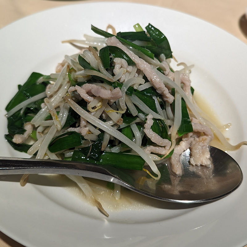 ニラ、もやし、豚細切り肉の炒め(塩味)