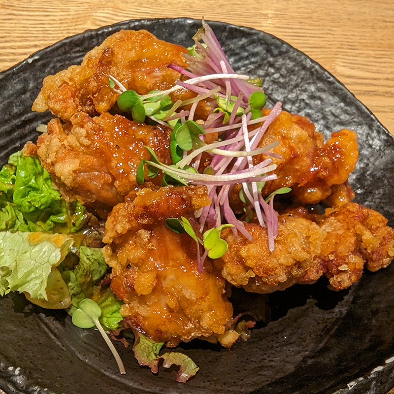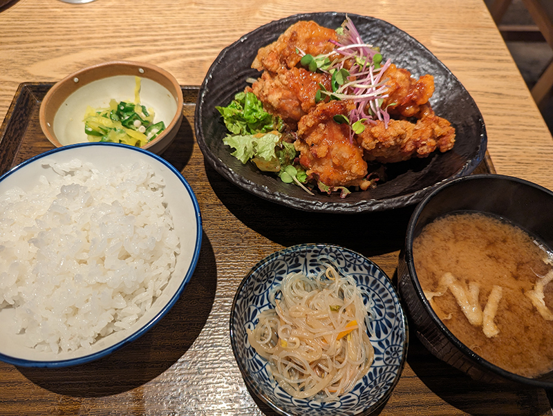 竜田揚げは油淋鶏仕立て。鶏はカラッと揚がっていて甘辛いタレが掛かっている。