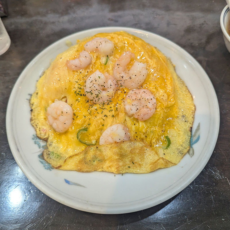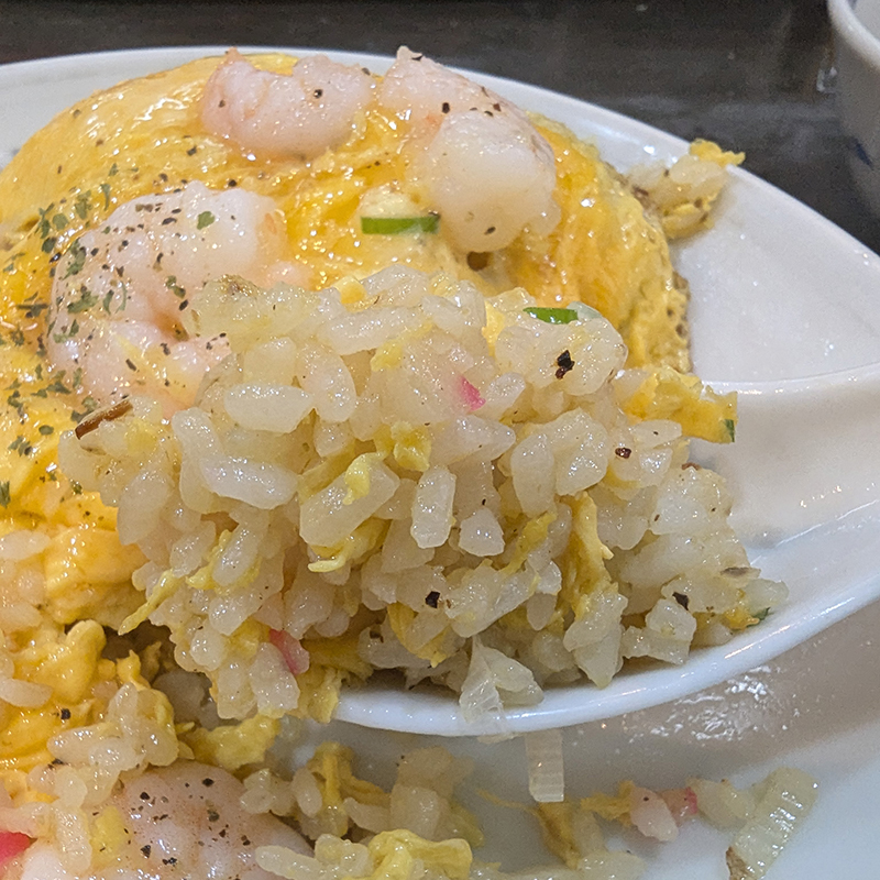 後乗せタイプのオムライスの様に玉子がチャーハン全体を覆い、更にその上に海老が彩る。