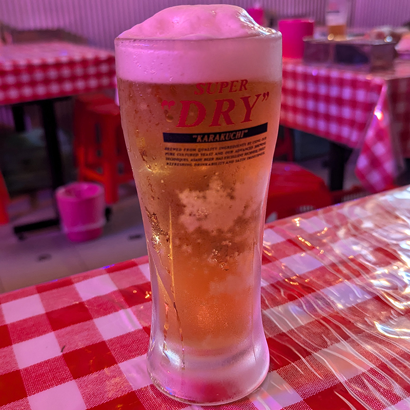 まずはビールで乾きを癒す。ビールはお膝元のアサヒの生。界隈では仕方ないところか。