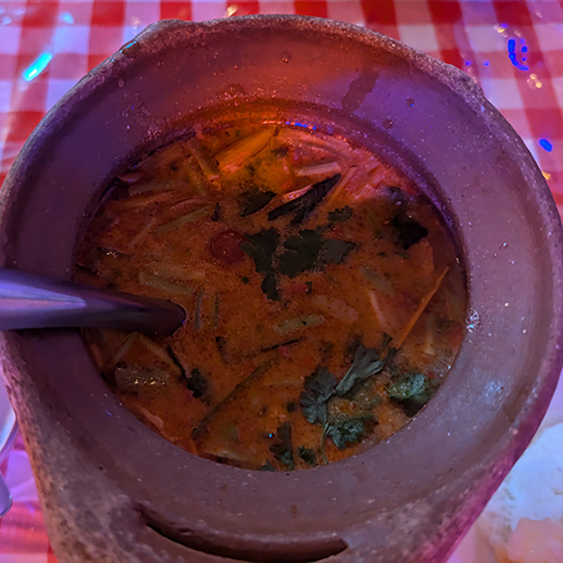 ココナッツミルクを使った個性派のトムヤムクンで。このため口当たりは優しいがすぐに辛さがやってきて、その後に酸味が訪れる。