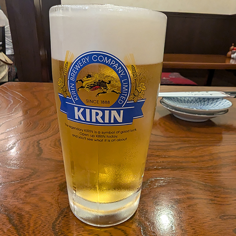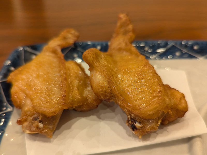 まずはビールを。お通しとして手羽先の素揚げが供された。
