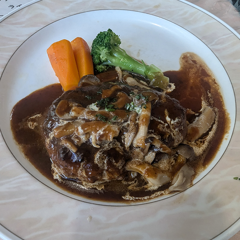 ほどなくして、ハンバーグの登場。付け合せはソテーしたブロッコリーとニンジンのグラッセと簡素ではあるが、ハンバーグそのものの面構えはいい。