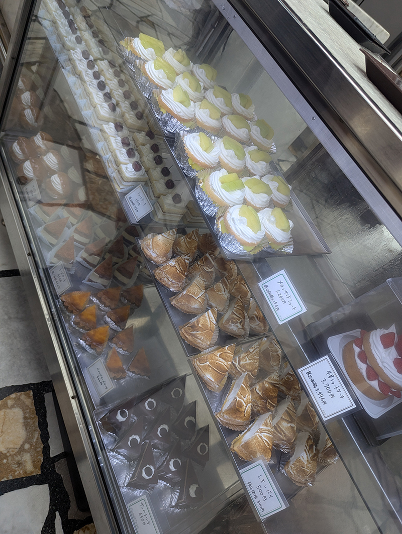 ショーケースには昔ながらの昭和の洋菓子が並ぶ。季節のケーキということでは、メロンやいちじくを使ったお菓子が目に付く。