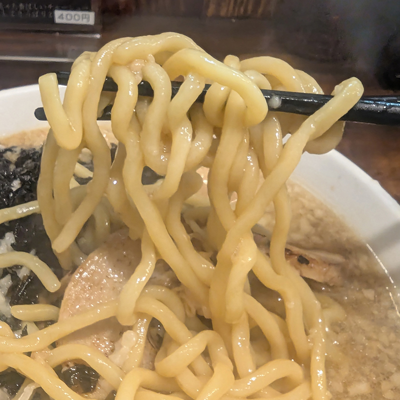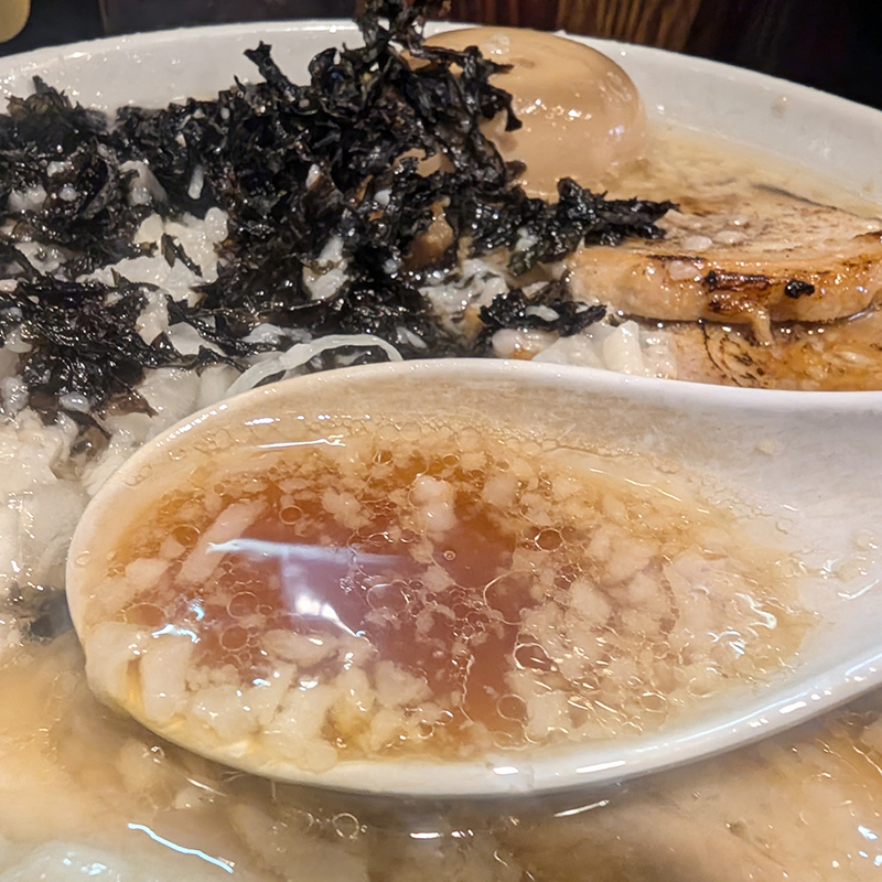 背脂は中。ここにも炙りチャーシューのほか、チャーシューがたっぷり。つまみチャーシューで閉口気味だったのでこれは正直やりすぎた。他に岩のり、玉ねぎ、煮玉子が入る。