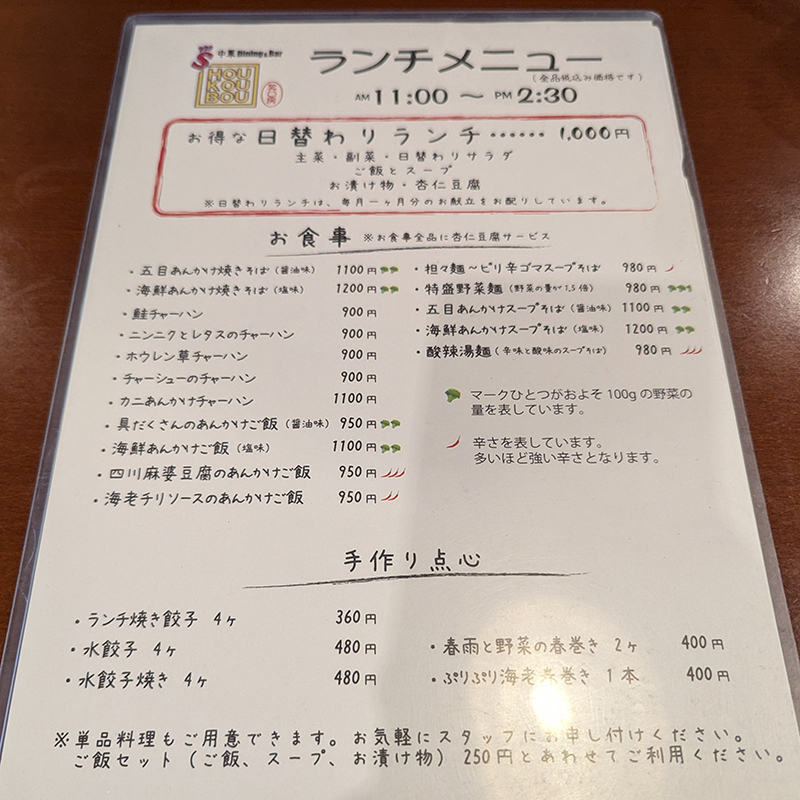 流石にこの時間なので日替りランチは既に売り切れ。仕方なく、ほかの料理のメニューを見ると炒飯メニューの種類が突出して多いのが目に付いたのでここから選択することに。