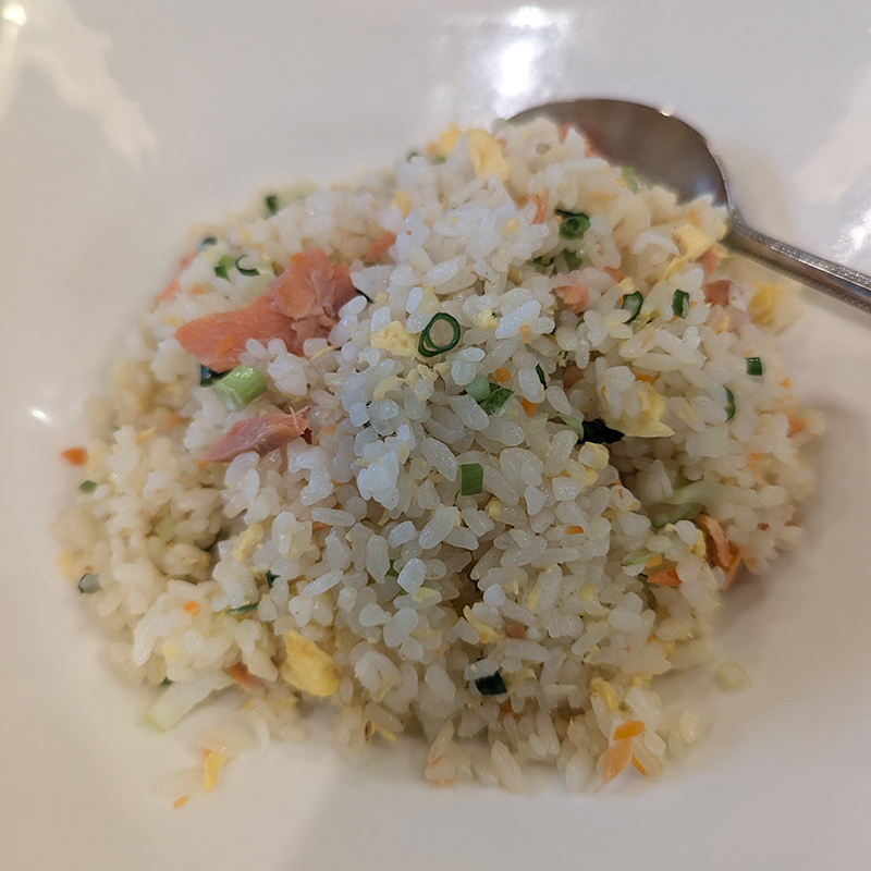 チャーハンもその流れで味付け自体は薄味。その辺りを鮭の塩気が補ってくれるので全体としてはちょうどいい。ごはんはパラでもベチャでもないちょうど中間くらいの火の通し。