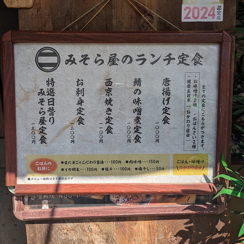 唐揚げが4個にサラダと小鉢が2種付いてくる。面白いのが味噌汁が2種類付いてくるところ。そこは店名のみそら屋に由来する。この日は京都の白味噌と信州味噌の2種類。