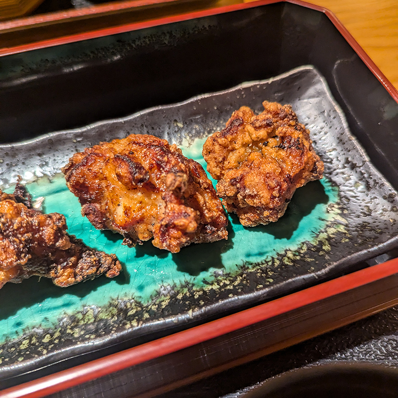 唐揚げは下味がしっかりとしている。高温の油でさっと揚げているので衣がサクサクとしてごはんが進む。