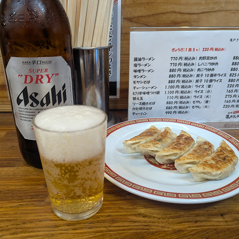 注文をするとビールとほぼ同時に1枚目の餃子が供される。ちょうどいい焼き加減。ビールの冷え方は錦糸町店と比べるとやや温め。