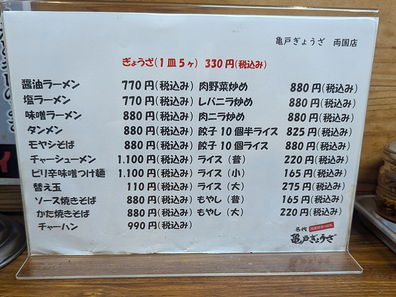 メニューは店舗ごとに微妙に異なり、餃子以外の提供も行う錦糸町店とも異なる。例えば、肉野菜炒めやレバニラ炒めがこちらでは頂ける。残念なことにきゅうりの酢漬けはメニューから姿を消していた。