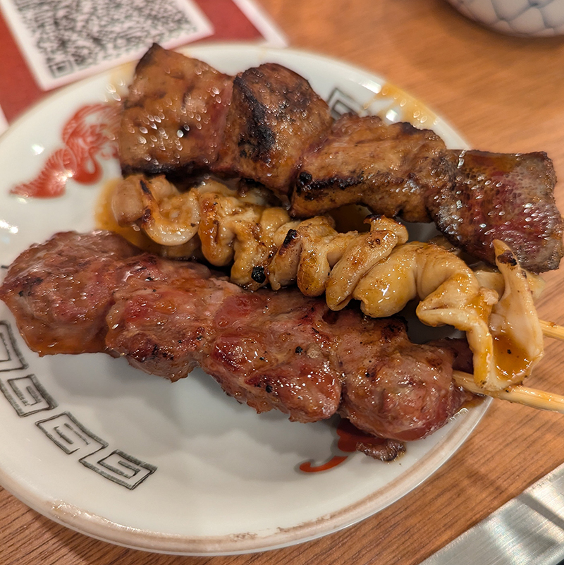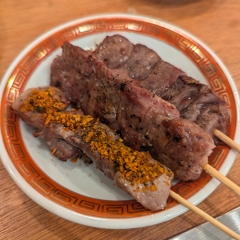 続いて、毛沢東、タン、ハツ。面白いのは毛沢東。中国料理店で見かける羊肉にスパイスを付けて焼いたもの。スパイスは少しシンプルながら案外悪くない。このあたりが中華寄りの大衆飯店らしさが出ている。