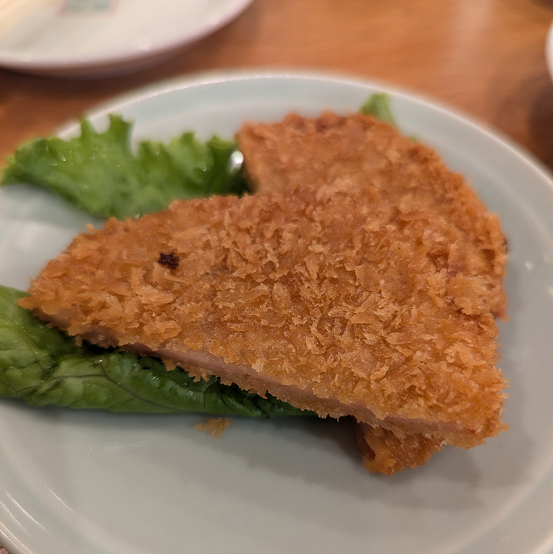 安価な値段に惹かれて注文したハムカツは衣がサクサクとしてソース味で味のベクトルが変わるのでいいアクセンになる。