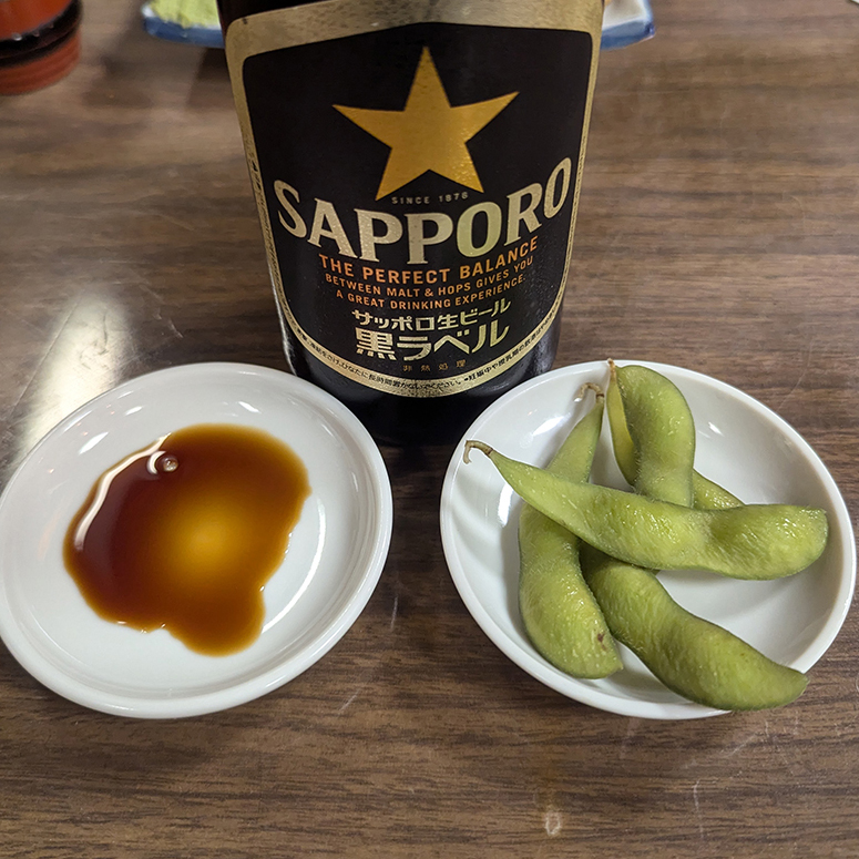 まずはビールを。お通しには枝豆が供された。蕎麦前前提なので前半戦はこちらのメニューから選択。
