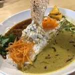 左がサグチキンカレー、右がスリランカビーフカレーで手前にはダル、奥にはアチャール、サンボルなどの副菜が添えられていて見た目にも美しい。ライスはインディカ米とジャポニカ米のミックスでスパイスに漬けたうずらの卵が鎮座する。