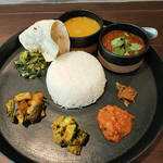 左がサグチキンカレー、右がスリランカビーフカレーで手前にはダル、奥にはアチャール、サンボルなどの副菜が添えられていて見た目にも美しい。ライスはインディカ米とジャポニカ米のミックスでスパイスに漬けたうずらの卵が鎮座する。
