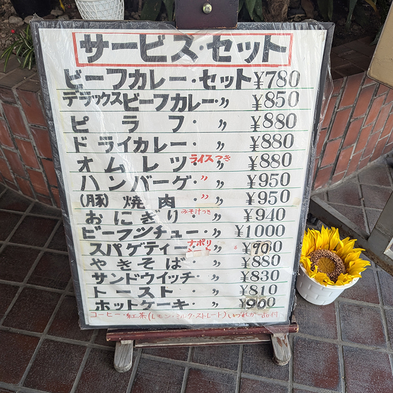 京葉道路から少し入った処にお店を構える昔ながらの昭和レトロな喫茶店。南口からは徒歩3分ほどと近い。