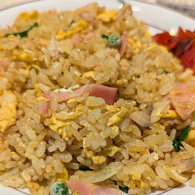 具材は玉子、ハム、玉ねぎ、マッシュルーム、ピーマン、グリーンピースに福神漬けが添えられている。
