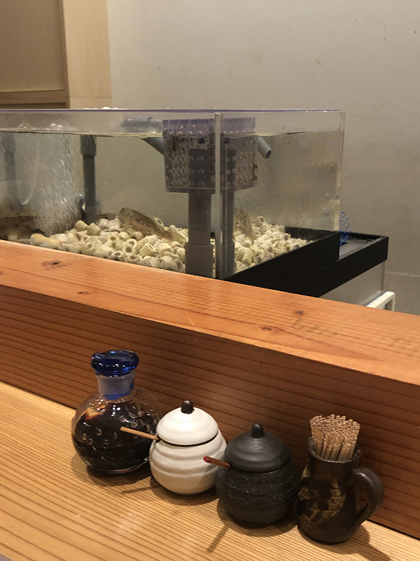 カウンターの上には整然と置かれた調味料と奥の水槽には天ぷらの素材が泳いでいた。