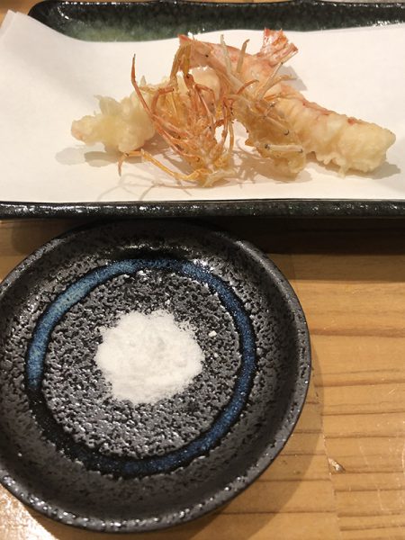 いずれも塩で頂く。サラリとして塩化ナトリウムが穏やかなタイプで天ぷらと相性がいい。