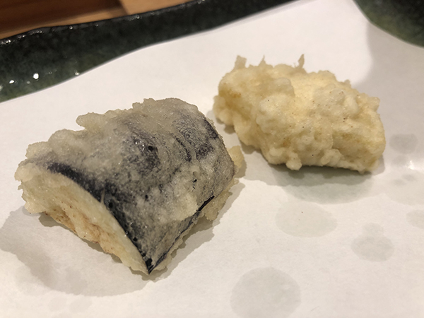 茄子とさつまいも。茄子は旨味が閉じ込められていて、噛むと白くて細かい湯気が立ち昇る。普段は茄子と穴子だけは天つゆ派だが、とてもジューシーで塩と合わせても美味しい。