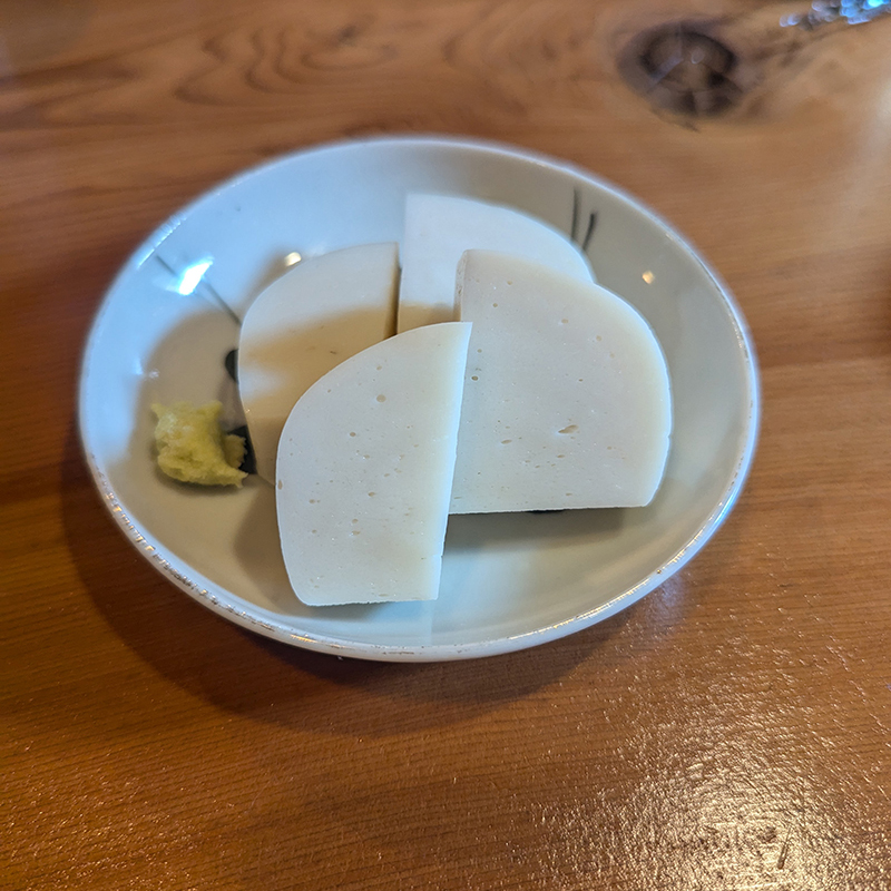最初は板わさ。厚めに切られた蒲鉾をおろしたての本わさびで頂く。本わさびだと美味しさもひとしお。