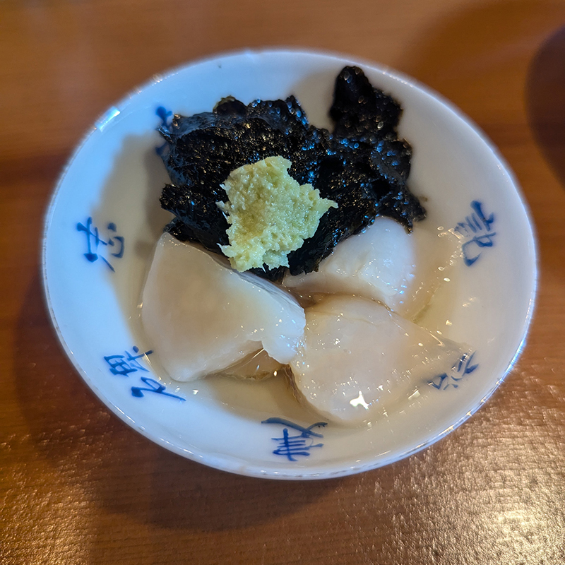 帆立に海苔の佃煮をあしらった料理。こちらは旧店舗から定番で手作りと思われる海苔が甘すぎすストイックな味付けなのが肴として申し分ない。
