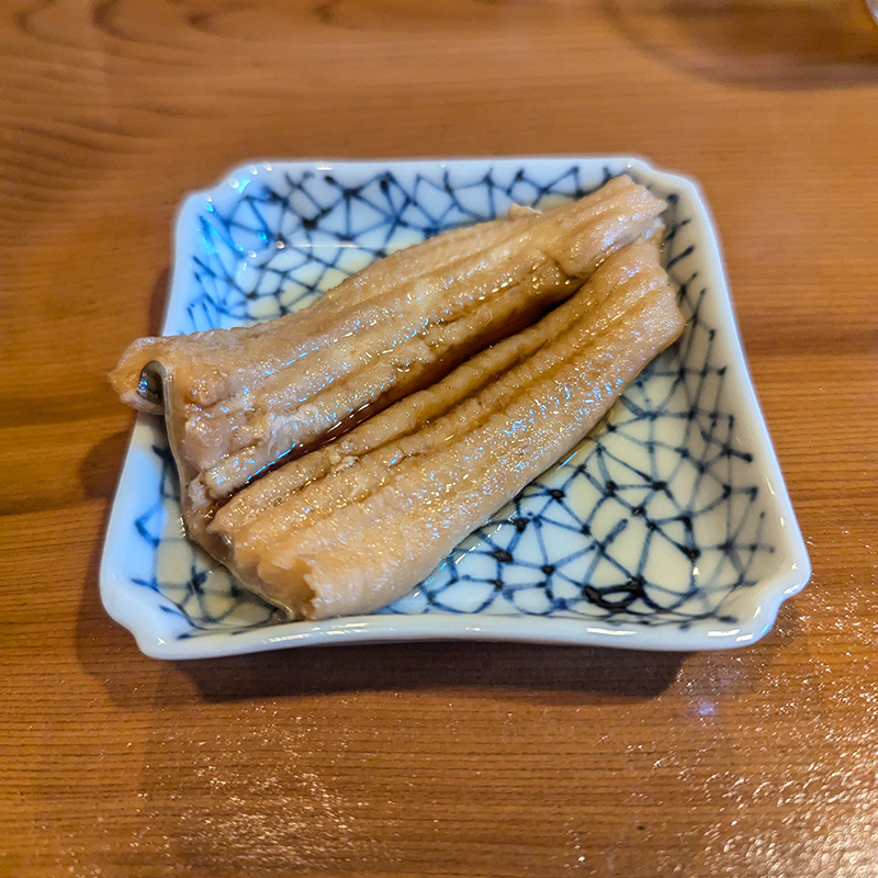 続いて煮穴子。これも定番でしっかりと味が染みていて日本酒が進む。
