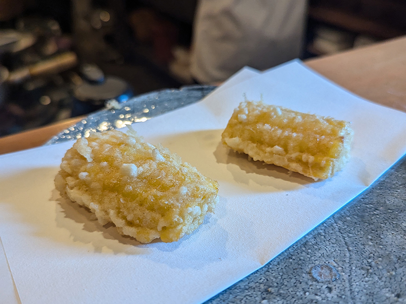 こちらのお店では初めてとなるとうもろこしが香り高く揚げることで甘みを増す。