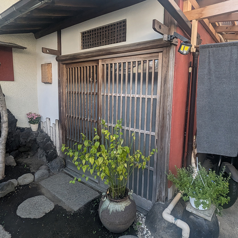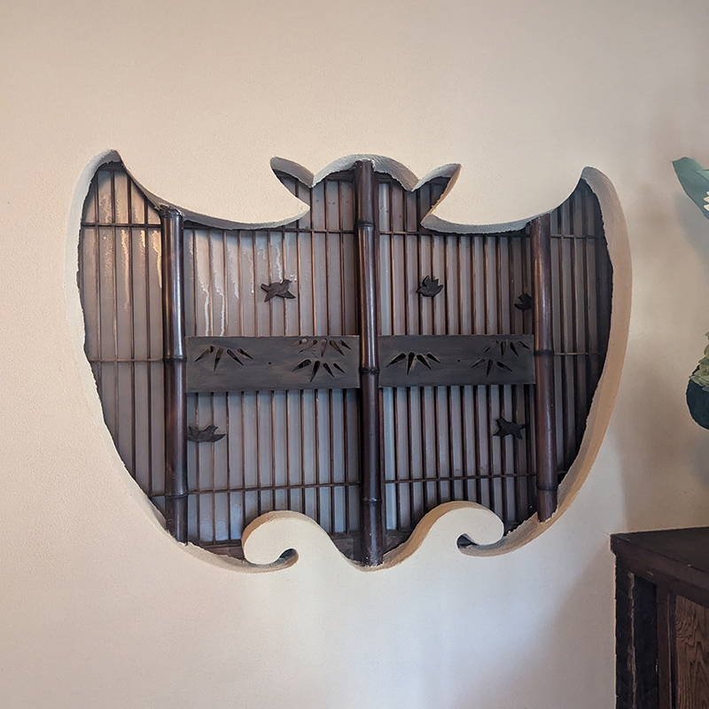 古い日本家屋を改装した店舗で、靴を脱いで店内に。玄関のところにあるコウモリをモチーフにした飾り窓など凝った意匠が随所に施されている。また洗面所に続く廊下など旅館を彷彿とさせる造りで面白い。
