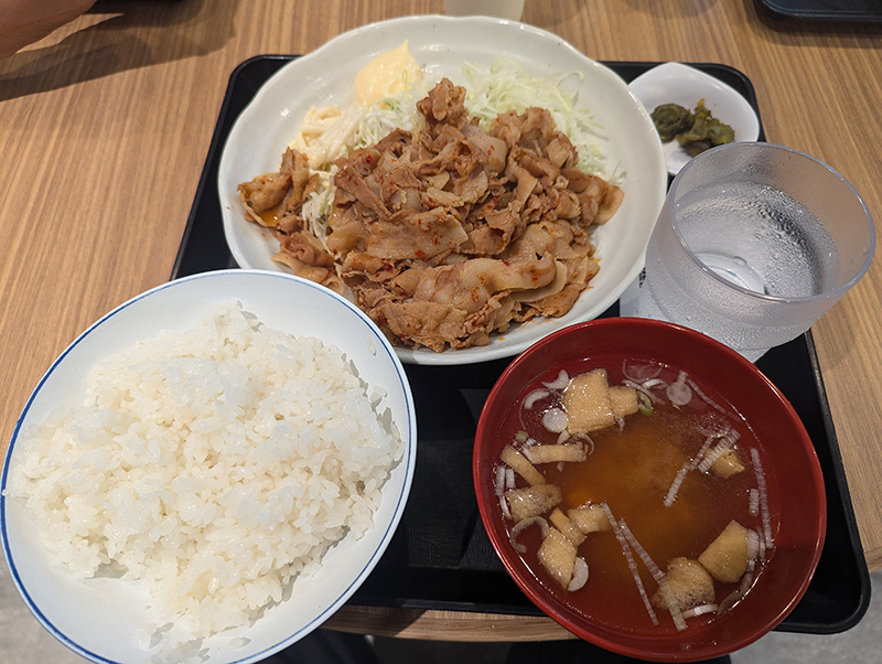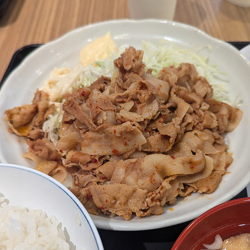 豚肉は薄切り肉を使用していて柔らかい食感で食べやすい。味付けは思ったよりも濃すぎず、大人しめ。