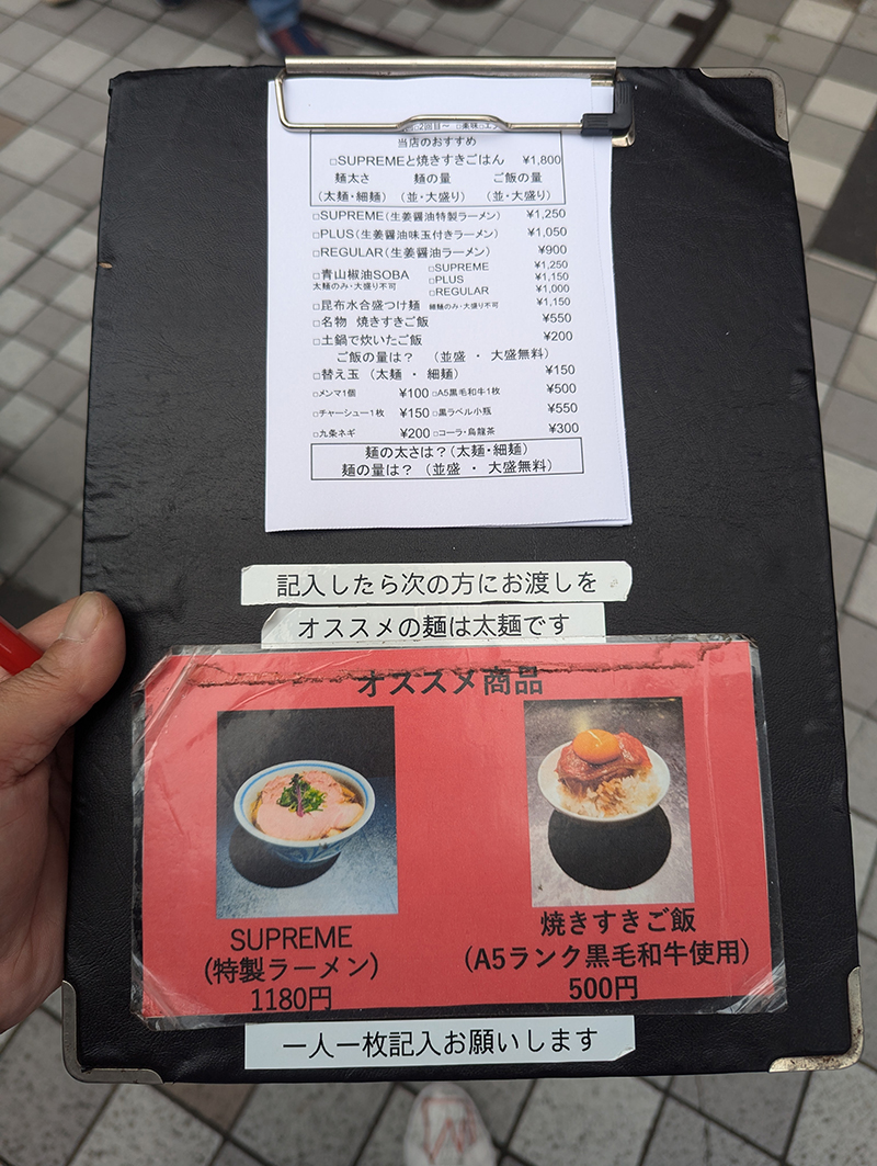 並んでいる間にメニューとメモを手渡され、事前に注文するメニューを記入し待つこと30分ほど。
