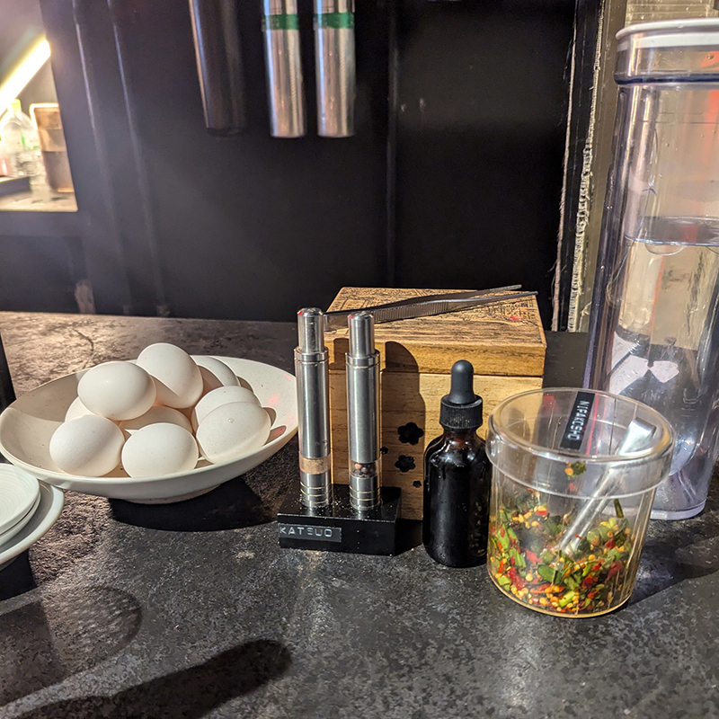 テーブルの上にはニラ胡椒、醤油、鰹節、胡椒などの各種調味料が用意されている。