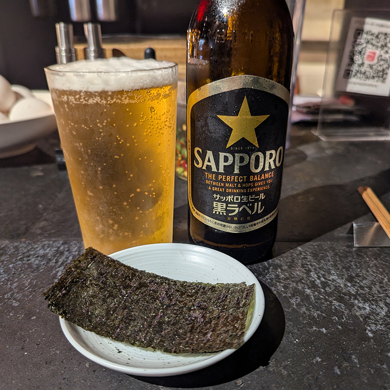 特に海苔と生卵が食べ放題なのはびっくり。それならばという訳で海苔をつまみにビールを頂く。