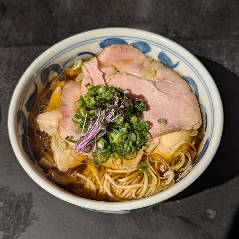 大きくカットされたチャーシューが一面を覆う。具材はチャーシューのほか、メンマ、2種類のネギ、ブロッコリースプラウトと至ってシンプルな構成だ。
