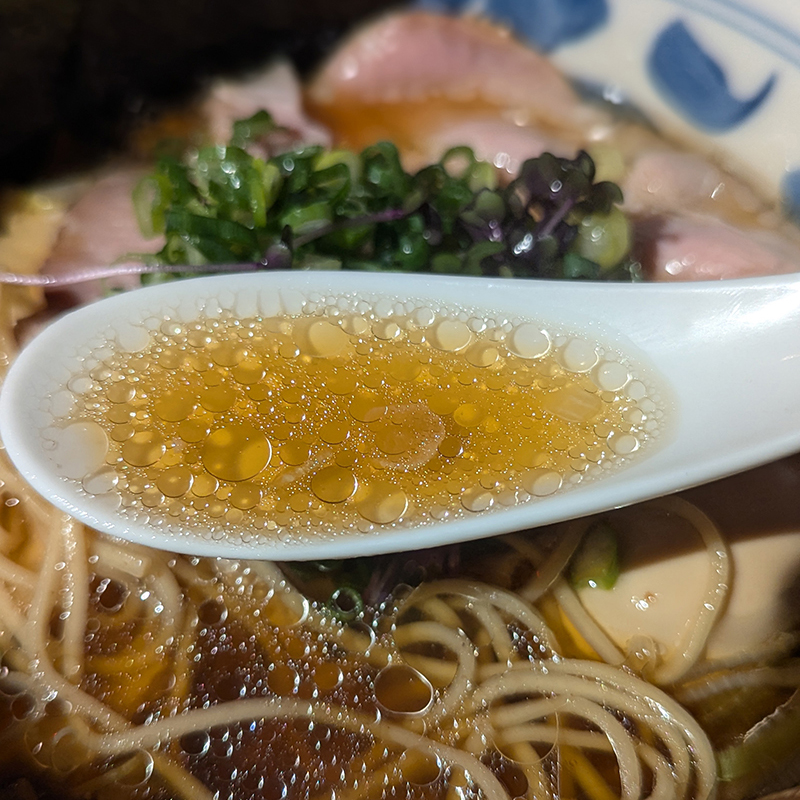 ブイヨンベースのスープに濃い口醤油と生姜コンフィの油で仕上げたスープは色味は薄く優しい味わいながら塩味は過不足なくしっかりとコクもあってバランス良くまとまっている。