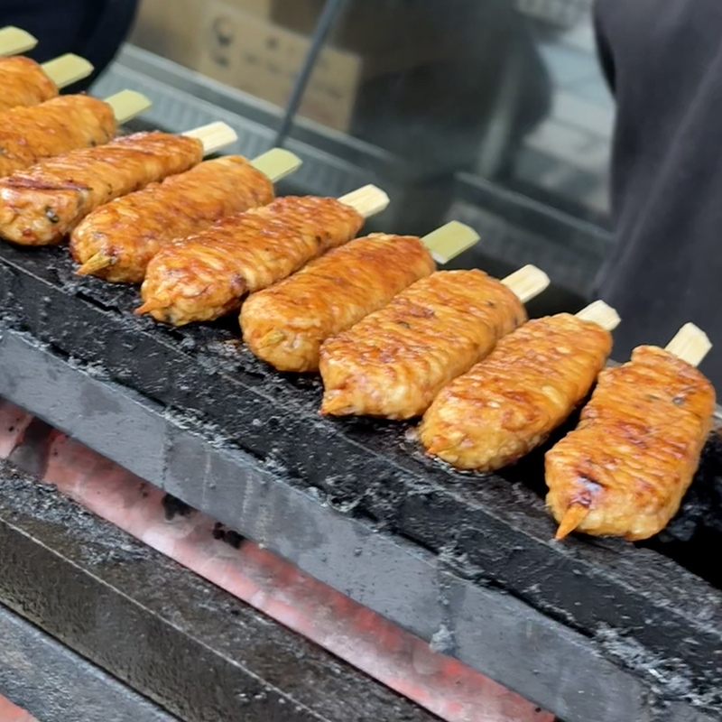 かっぱ橋道具まつりの日祭日はお昼からやきとりを販売している。この時、販売しているのはもも肉とつみれのみ。