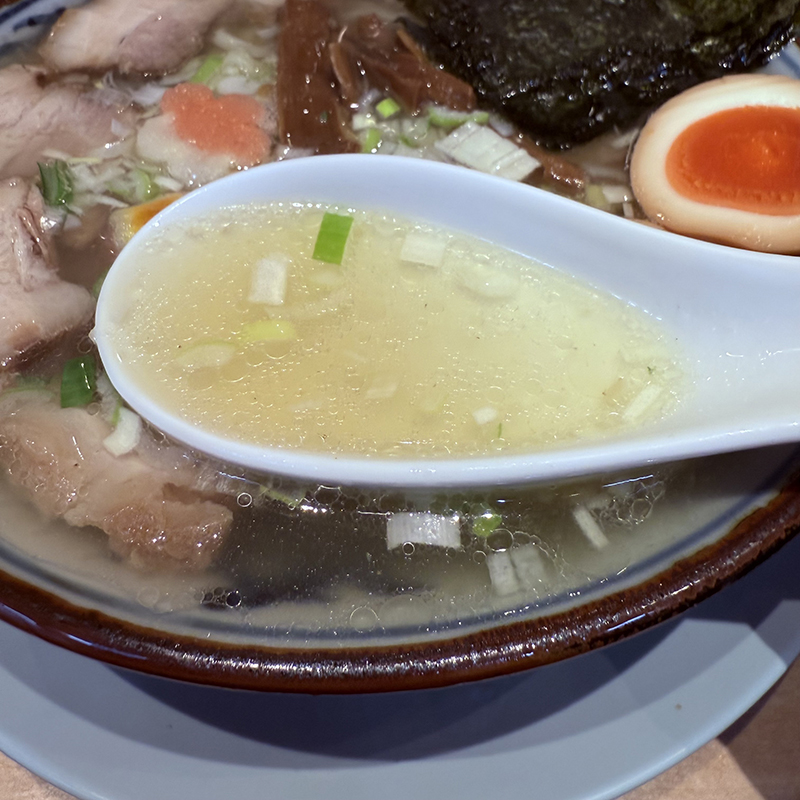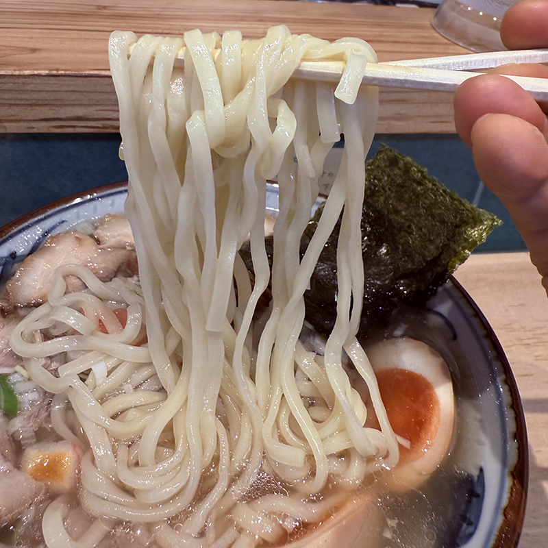豚骨ベースの澄んだ清湯スープは塩味がしっかりと効いて味の輪郭がくっきり。そして魚介系の出汁の香りがより深みのある味わいに。
