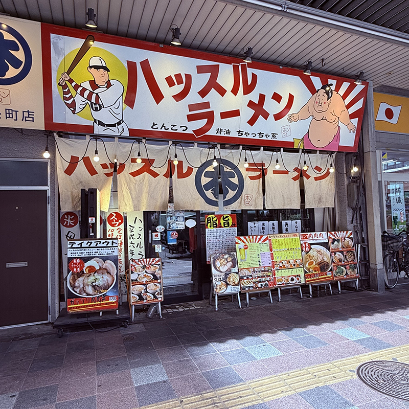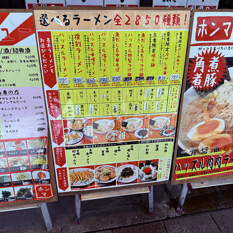 初見なので醤油系にするのは決まったものの店名を冠したハッスルラーメンにするか、より濃厚な復刻ラーメンにするか迷うところ。