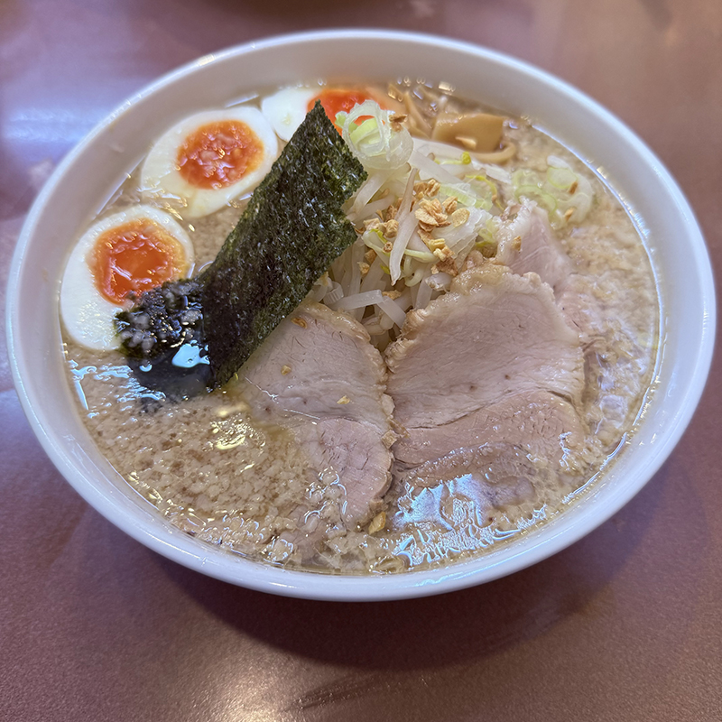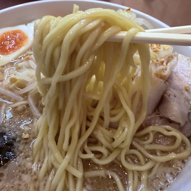 一面を背脂に覆われていてトーンは白い。これにチャーシュー、煮玉子、もやし、ネギ、メンマが入る。