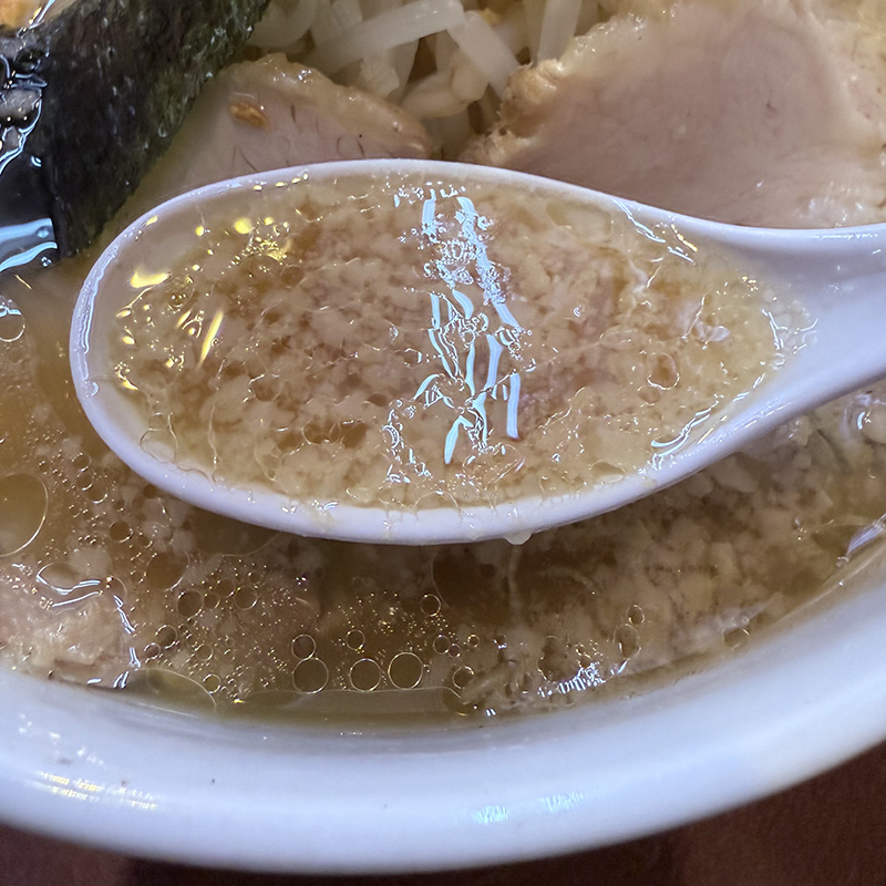 スープは塩味がほどよく効いているがマイルドで食べやすい。見た目ほどギトギト感がなく優しい味わい。