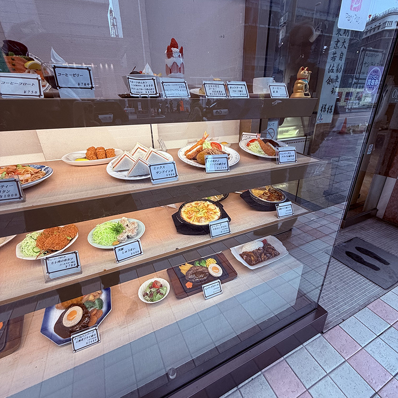 入口にあるショーケースには食品サンプルが飾られていて昭和レトロな趣きを感じる。